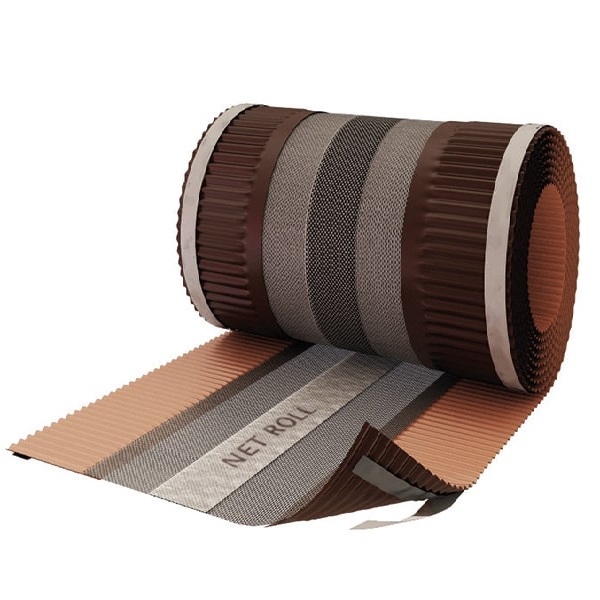 O remate NET ROLL é composto por alumínio, tecido não tecido em PP e fita butílica. As bandas plissadas de alumínio podem ser moldadas para se adaptarem aos vários tipos de telhas ou cumes e aderir aos mesmos graças a uma banda butílica de 1,5 cm.